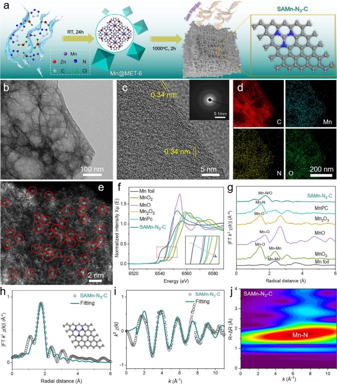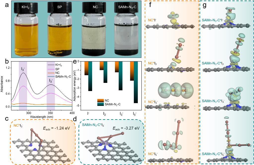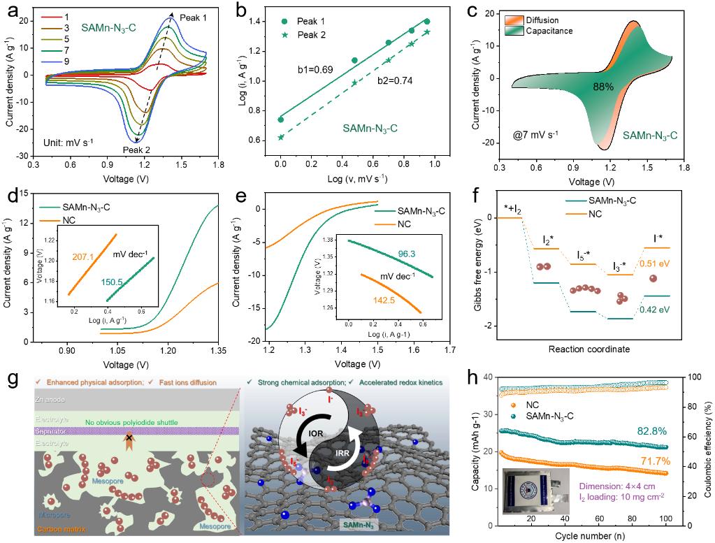本文开发了一种高N掺杂介孔碳负载Mn单原子(SAMn-N3-C)正极材料,以用于电解质Zn-I2电池。该材料不仅可以通过物理化学作用锚定碘物种,抑制多碘化物穿梭,同时不饱和配位的Mn-N3可以进一步增强对各类碘物种的有效吸附,并通过降低碘转化化学中速率决定步骤的吉布斯自由能,加速反应动力学,增强转化效率,这种多功能碘宿主材料具有的协同作用显著提升了Zn-I2电池的性能,在1 A g-1时容量达到336.2 mAh g-1,并可稳定工作50,000个循环。这一工作通过将单原子催化剂与多孔结构相结合,建立了具有物理化学限域和高效转化协同作用的碘宿主材料新方法,有望推动Zn-I2电池技术在实际应用中的进一步发展。