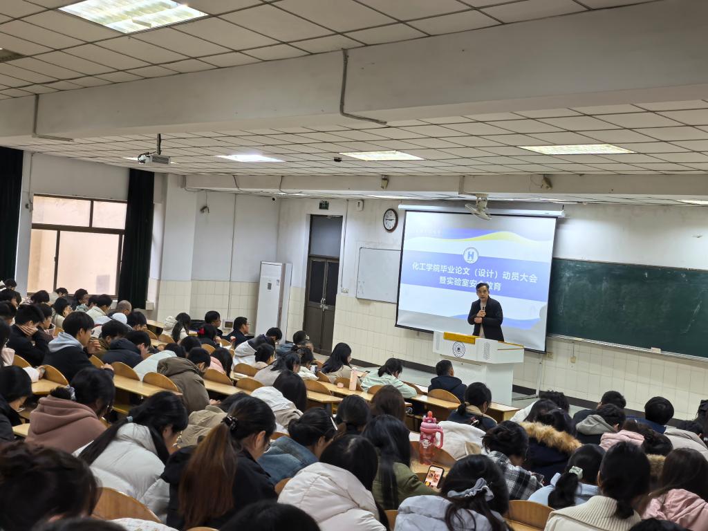 为进一步强化2026届毕业生的实验室安全意识,提升毕业论文(设计)整体质量,3月17日下午,化学与化工学院在秀山校区东教一阶101召开2026届本科生毕业论文(设计)动员暨实验室安全教育大会。学院副院长夏友谊主持会议,学院党委书记黄宇弦,党委副书记、纪委书记、副院长冀秀芝,各专业系室负责人、毕业班辅导员及2026届全体毕业生参加大会。